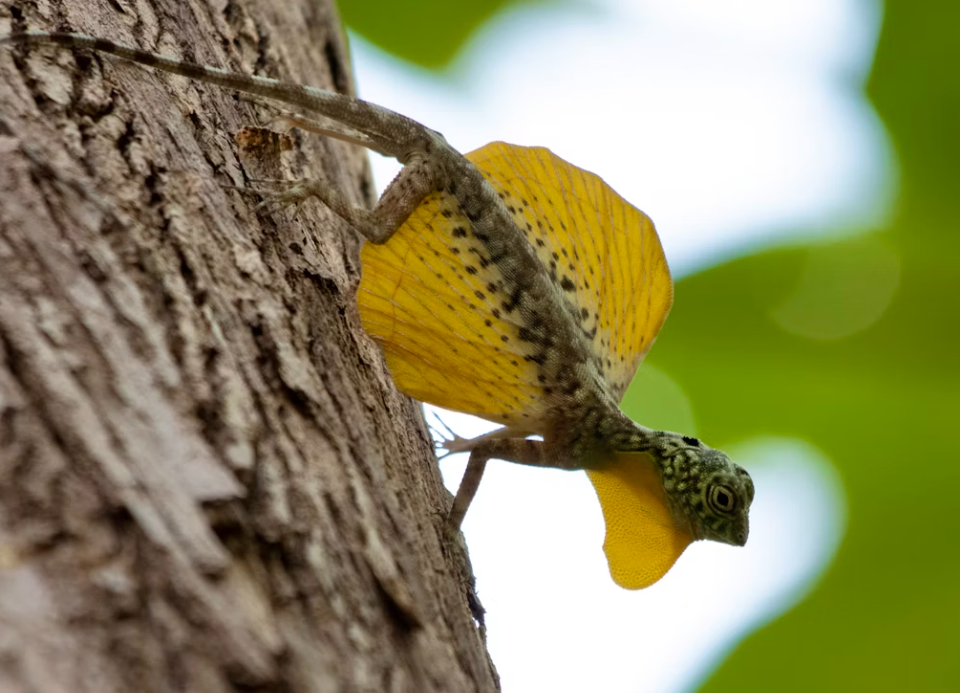 드라코 볼란스는 파충류 도마뱀과에 속하는 작고 날렵한 생물로, 몸길이는 약 20~22cm이며 대부분의 시간은 나무 위에서 보냅니다. 이름 ‘드라코’는 라틴어로 '용'을 의미하고, ‘볼란스’는 '날다'라는 뜻입니다. 이 이름은 곧 이 동물의 가장 독특한 특징, 바로 하늘을 ‘활강’하는 능력을 함축하고 있죠. 이 도마뱀은 일반적인 날개를 가진 새나 곤충과는 다르게, 갈비뼈가 옆으로 길게 뻗어 피부막을 지탱하며 '파타지아'라는 얇은 비막을 형성합니다. 이 구조는 드라코 볼란스가 공중에서 몸을 펴고 나무 사이를 자유자재로 이동할 수 있게 도와줍니다. 실제로는 날개를 퍼덕이며 나는 것이 아니라 도약 후 활강하는 방식입니다. 짧게는 몇 미터에서 길게는 30미터 이상의 거리도 가볍게 이동할 수 있습니다. 또한 수컷은 목 아래에 있는 밝은 색의 '드와플'을 펼쳐 영역을 표시하고 암컷에게 구애합니다. 이때 수컷의 파타지아는 오렌지나 노란빛이 돌며, 암컷은 보통 연한 청색 계열입니다. 색채의 차이만으로도 성별을 구분할 수 있는 이 도마뱀은 시각적인 신호를 적극적으로 활용하는 것이 특징입니다.