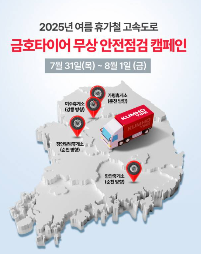 여름 휴가철 금호타이어가 안전운전의 첫걸음으로 고속도로 휴게소에서 무료 타이어 안전점검 캠페인 실시합니다.